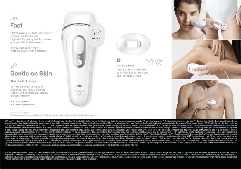 - Type d'épilateur : lumière pulsée, elle permet une épilation semi-définitive des poils en endormant les follicules pileux. La lumière émise est absorbée par la mélanine des poils, en contraste avec la peau, afin d'arrêter le cycle de croissance