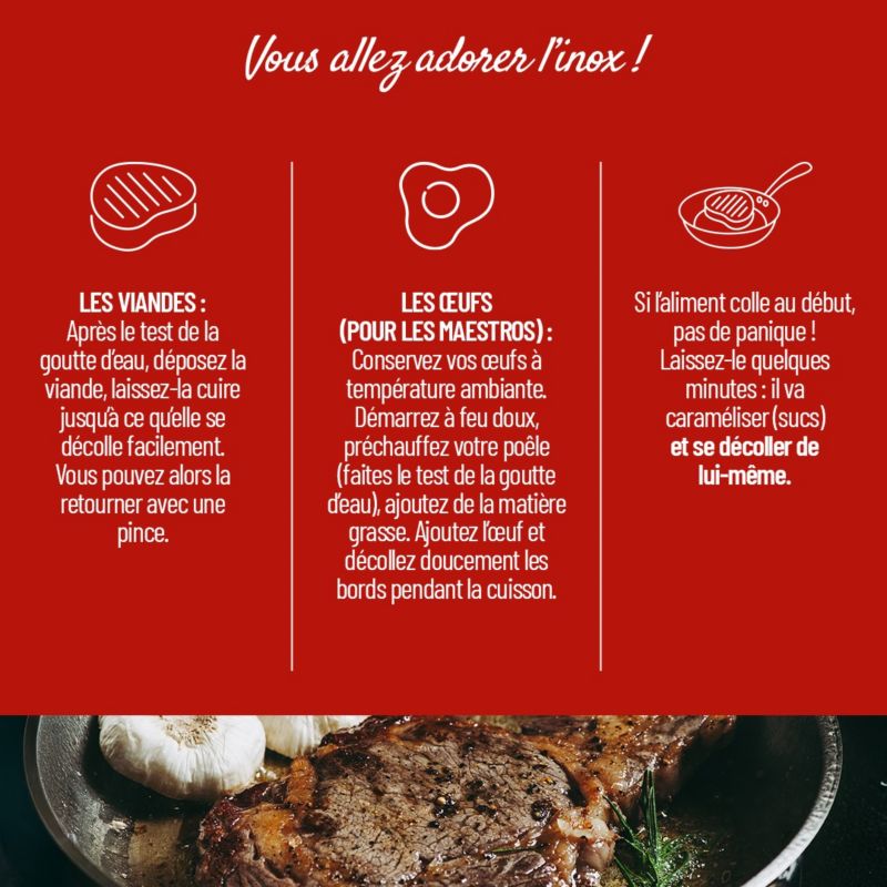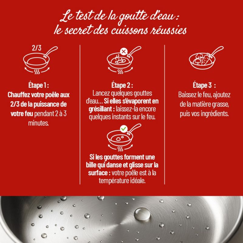 - Le saviez-vous ? : Pour une poêle en acier inoxydable, préchauffez à feu doux/moyen quelques minutes. Testez avec une goutte d'eau : si elle perle et glisse, la température est parfaite. Ajoutez votre matière grasse et vos aliments pour une cuisson réussie, sans accroche.