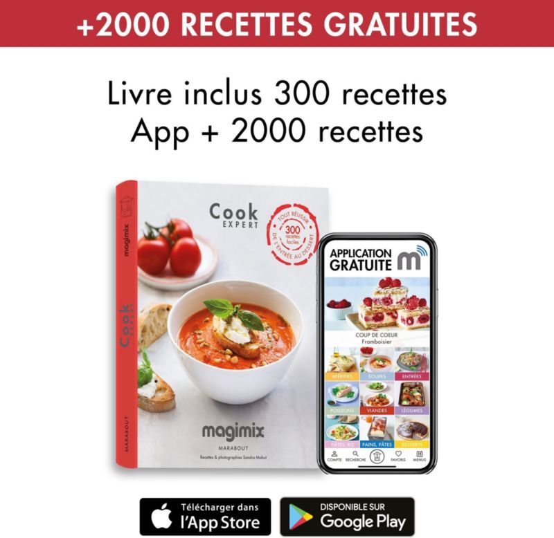 - Livré avec : Notice, Livre de recettes, 3 cuves (cuve standard, mini-cuve, midi cuve), balance de cuisine, batteur, blender, boîte de rangement des accessoires, disque(s) éminceur, disque(s) râpeur, lame de pétrissage, lame universelle, mini bol, mini couteau
