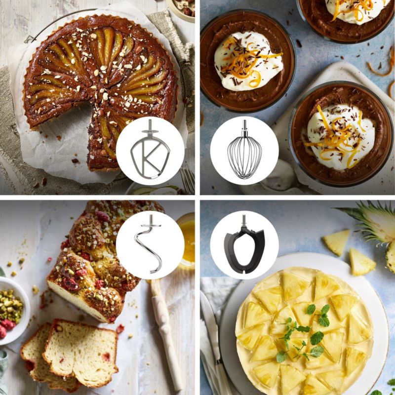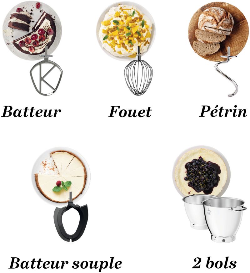 - Accessoires : batteur, batteur souple, fouet, couvercle anti-projections, crochet pétrisseur, fouet à fils, spatule