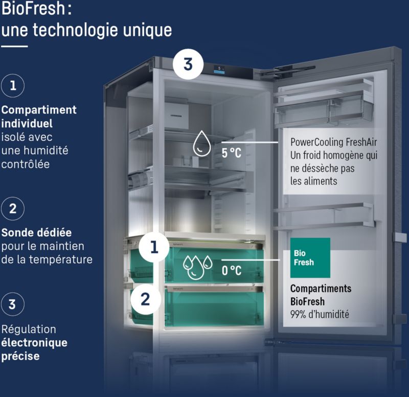 - Froid du réfrigérateur : le froid brassé permet de répartir le froid de manière homogène avec une humidité idéale pour les produits frais