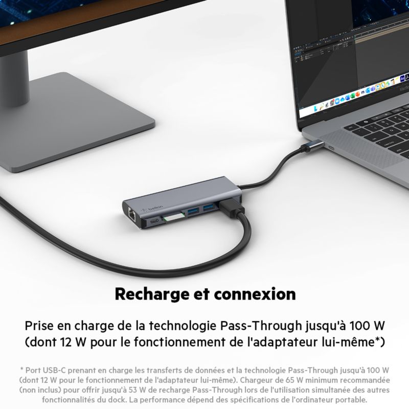 - Avantages : ? Ports multimédia et Ethernet à disposition ? Connexion de projecteurs, moniteurs, cartes SD et clés USB ? Port Ethernet pour une connexion Internet sécurisée ? Passthrough (jusqu'à 100 W) pour éliminer le besoin de choisir entre connexion et alimentation