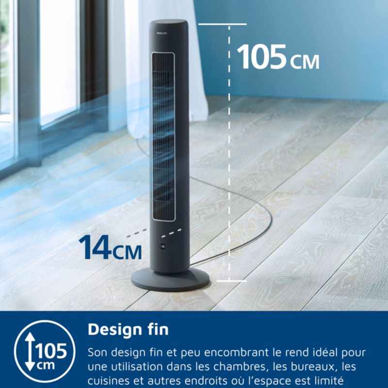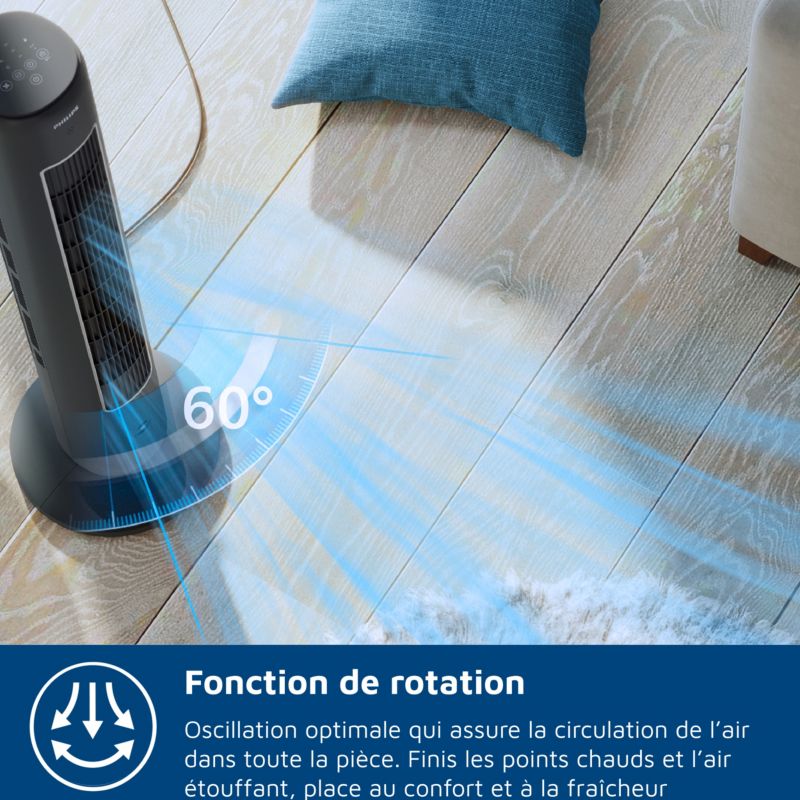 - Format du ventilateur : colonne, déplaçable et peu bruyante, elle est conseillée pour une chambre ou un bureau