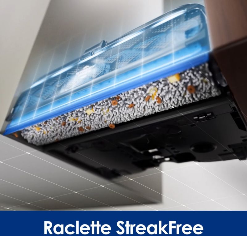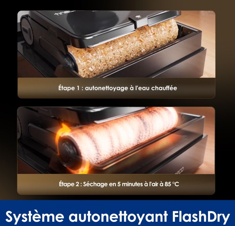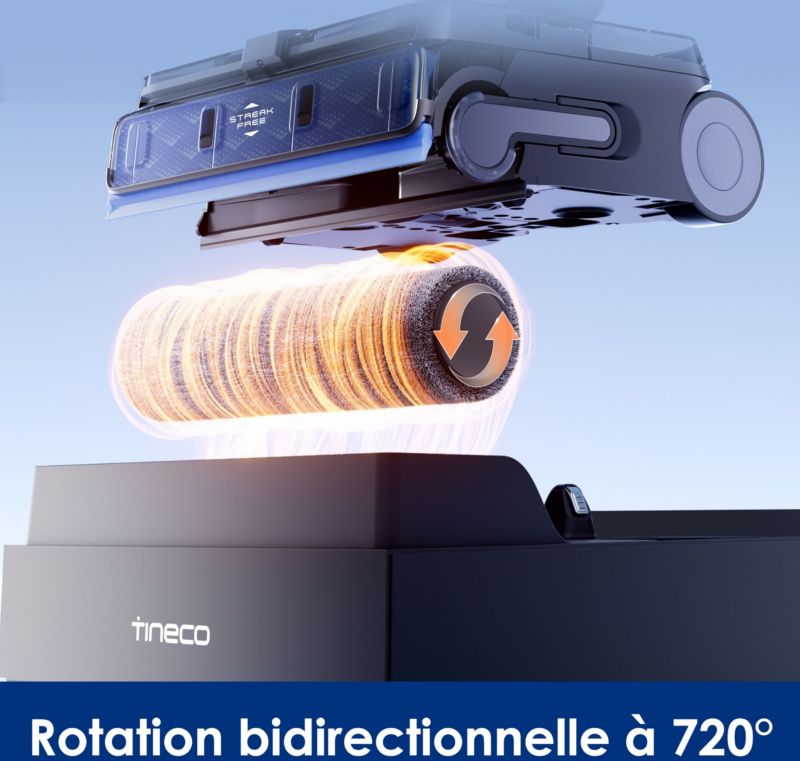 - Capteur de niveau de salissure : oui, adapte la vitesse de rotation du rouleau et le débit d'eau selon la salissure détectée