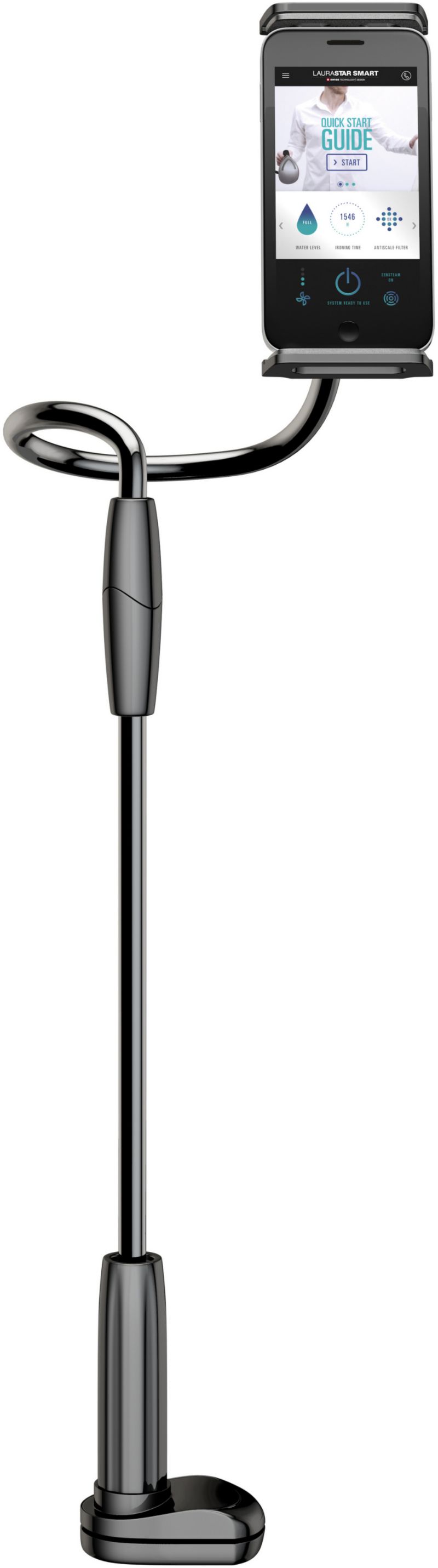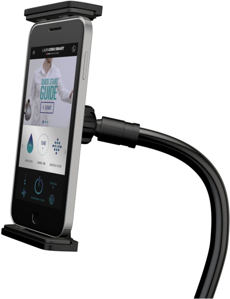 - Votre téléphone mobile est maintenu, il suffit de choisir l'emplacement optimal du support sur votre système de repassage Laurastar. Son bras articulé lui permet une orientation dans toutes les directions.